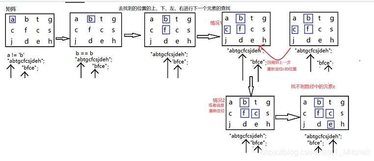 给定一个字符串,在一个定义好的矩阵中,可以从任意位置出发,查找有没有给定字符串的路径。假设当前位置的元素ch对应到路径中的第i个字符。如果对应成功,即就是该字符对应路径的第i个字符也正好是ch,接下来去矩阵中的ch字符所在位置的上、下、左、右进行路径中下一个字符的匹配,若不能匹配成功,回溯到上一步,重新进行字符定位。