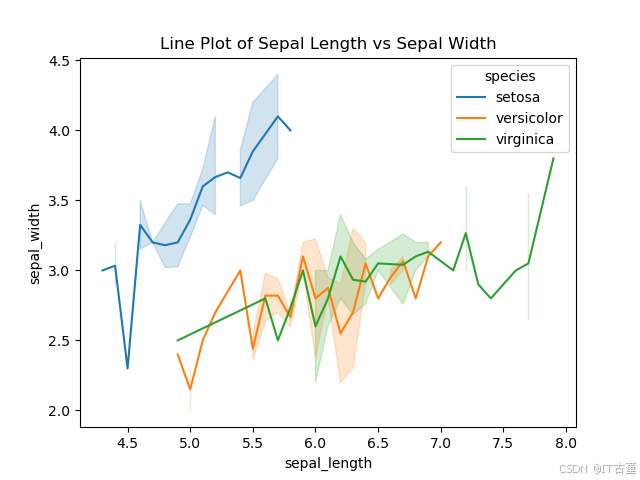 plt.title("Line Plot of Sepal Length vs Sepal Width")