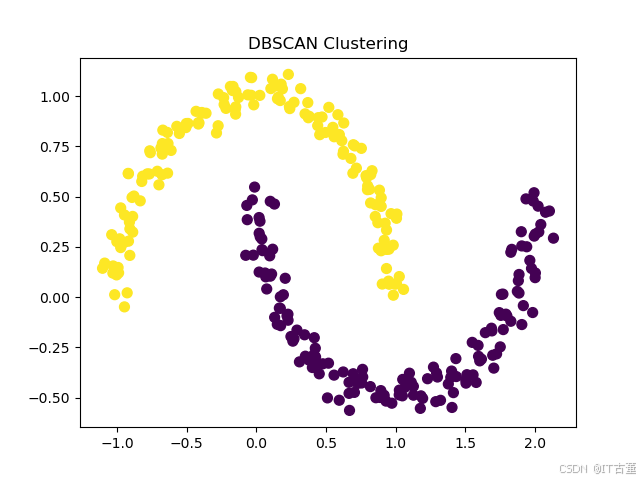 DBSCAN 是一种基于密度的聚类算法,能够发现任意形状的簇,并有效识别噪声点。它通过数据点的密度分布来定义簇,避免了指定簇数量 k 的需求。