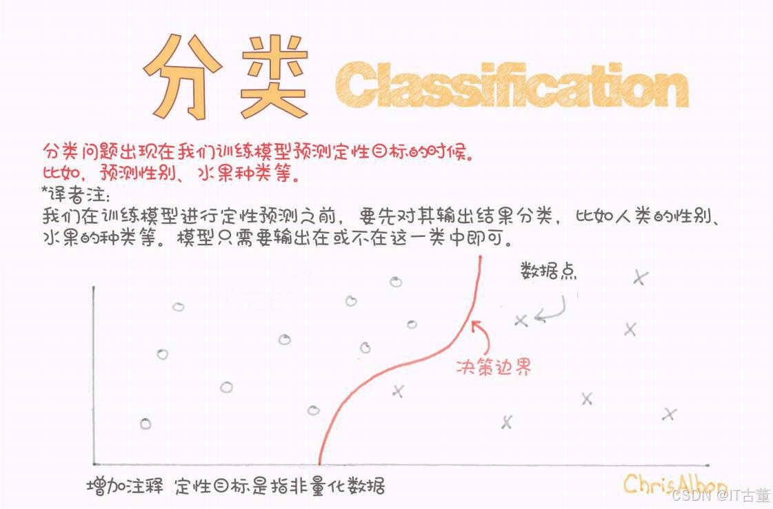 - 输出:每个数据点对应的类别 Y,取值为离散型变量,例如