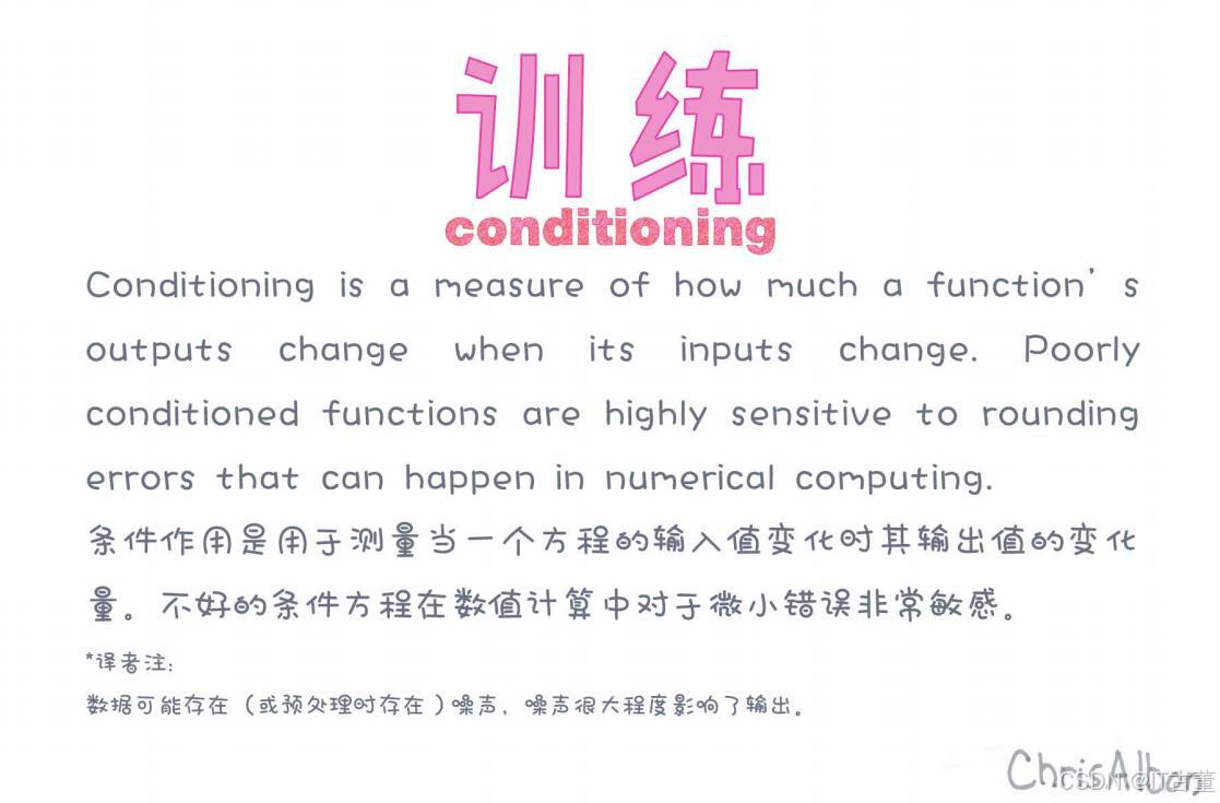 “Conditioning”在某些上下文中还与“条件数”(condition number)等数学概念相关,这些概念对算法的收敛性和稳定性有重要影响。