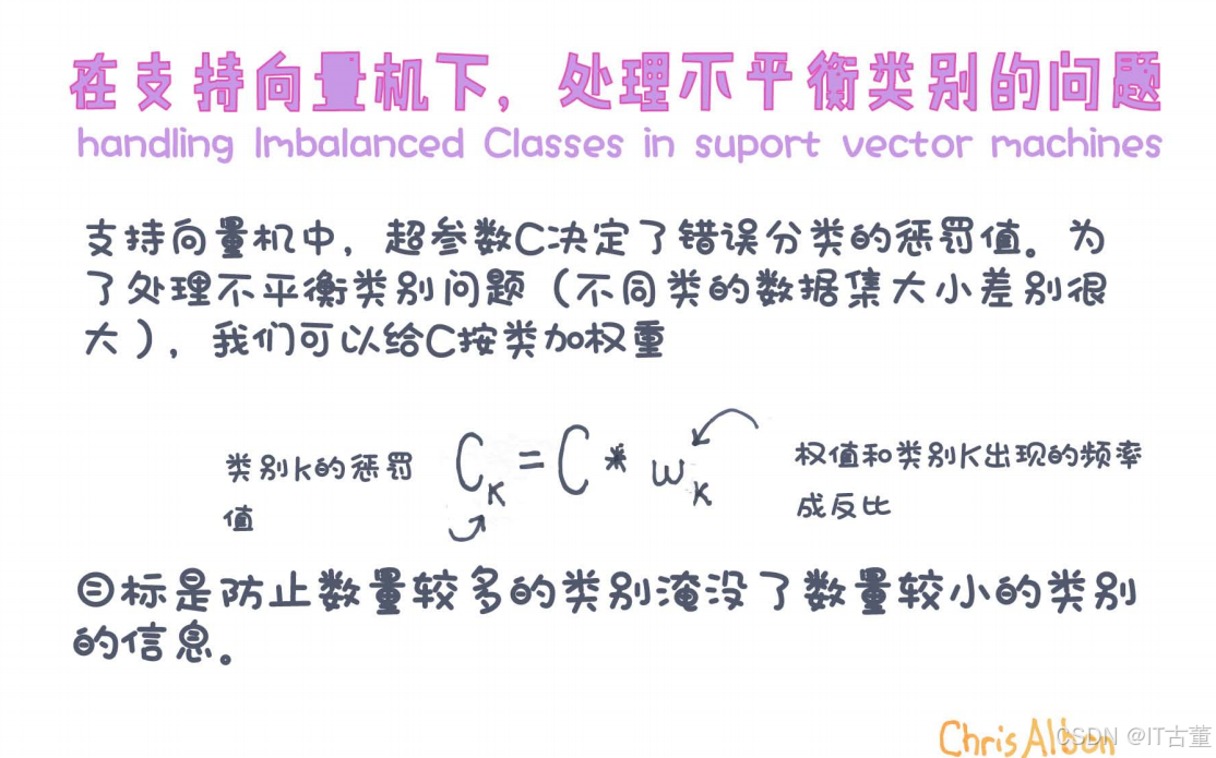 - 原理:给少数类样本分配更高的权重,增加其在损失函数中的贡献,从而使 SVM 更关注少数类。