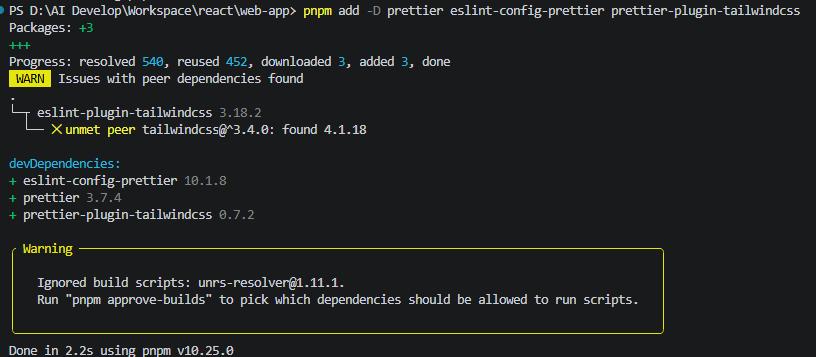 pnpm add -D prettier eslint-plugin-prettier eslint-config-prettier eslint-plugin-tailwindcss