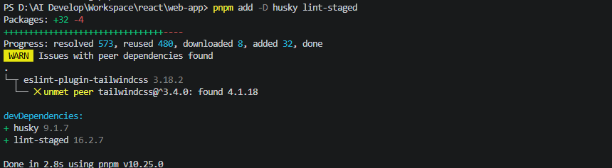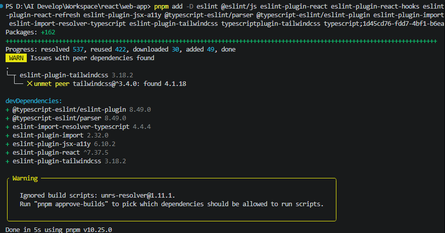 pnpm add -D eslint @eslint/js eslint-plugin-react eslint-plugin-react-hooks eslint-plugin-react-refresh eslint-plugin-jsx-a11y @typescript-eslint/parser @typescript-eslint/eslint-plugin eslint-plugin-import eslint-import-resolver-typescript eslint-plugin-tailwindcss typescript