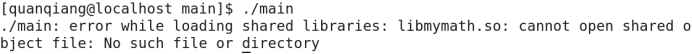 这时我们会发现系统报错了,说的是载入共享库时出错了,原因是找不到共享库,但是当前目录下是有这个libmymath.so的,那为什么系统找不到呢?