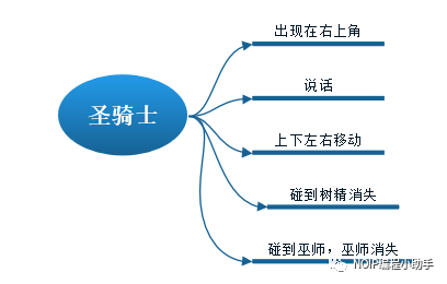 在这期间巫师就会拼命去逃,到底怎样才能做到圣骑士抓住巫师呢?:巫师在碰到圣骑士前是安全的,当巫师碰到圣骑士,代表巫师被消灭,用“隐藏”表示;由于巫师已被打败,所以游戏结束,游戏结束用“停止全部”表示。