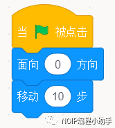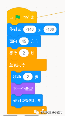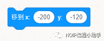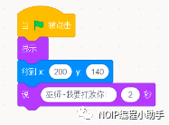①定位:当小绿旗被点击(开始),巫师出现的位置应该是固定的。巫师每次重新开始就会回到规定的初始位置,所以使用定位积木