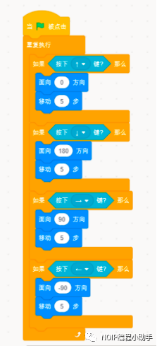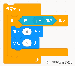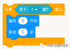 ⑤如图积木组合每次按下“上”移动键,圣骑士会向上移动5步。同理,按键“下”、“左”、“右”控制我机飞行方向只需要修改按键和面向方向这两个积木即可。