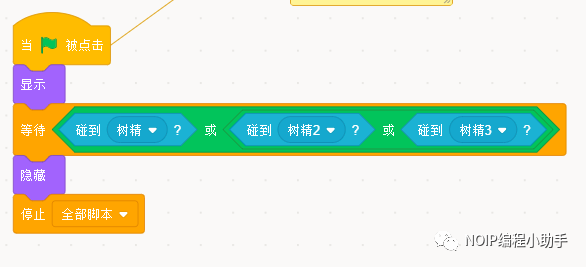 树精的出现就是为了阻挡圣骑士去抓巫师的,当圣骑士撞上巫师后,圣骑士会失败,游戏也会结束,所以,圣骑士要努力地躲开树精哦!其实,圣骑士撞上树精与巫师被抓的程序是一致的,借此我们可以先考察同学们的记忆力,再做讲解。具体程序如下: