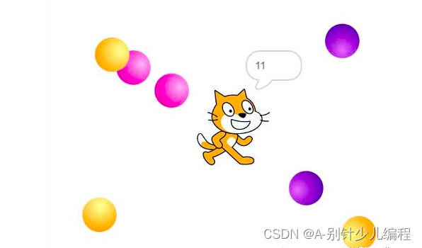 小球随机选择舞台四个角向小猫飞过去,碰到小猫后消失,小猫实时说出接到了多少个球。
