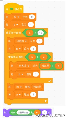 (1)点击绿旗,计算1+(1+2)+(1+2+3)+(1+2+3+4)+ ......+(1+2+3+4+5+6+7+8+9+10)的值;