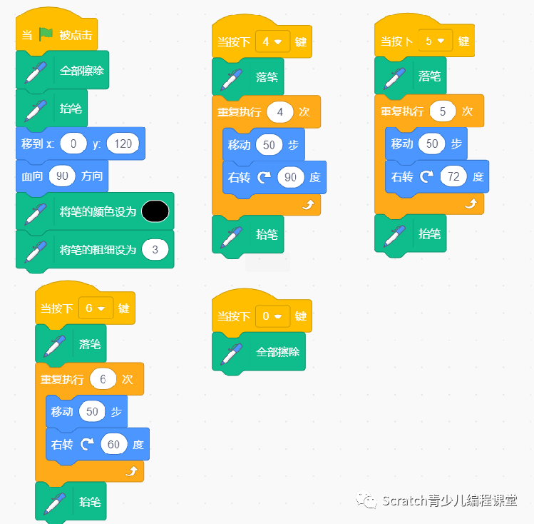 (1)点击绿旗,小猫角色面向右方,坐标为(0,120);全部擦除舞台上的图案,设置画笔颜色为“黑色”;