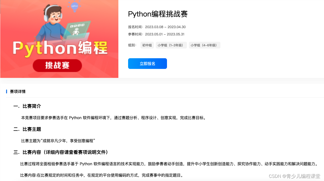 Python 编程挑战赛初赛采用线上考试比赛形式,分为小学组和初中组。不同组别的考核重难点略有不同,考核内容主要是 Python 基础知识,共 30 题,均为单选题,具体考核如下: