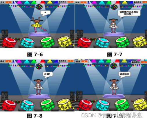 1、每次点击绿旗后,舞台左上角的“得分”(显示位置见图-2) 都为 0;2、小女孩为造型 1 (白色裙子) ,并说“请观察颜色序列!”2 秒钟 (图-2)