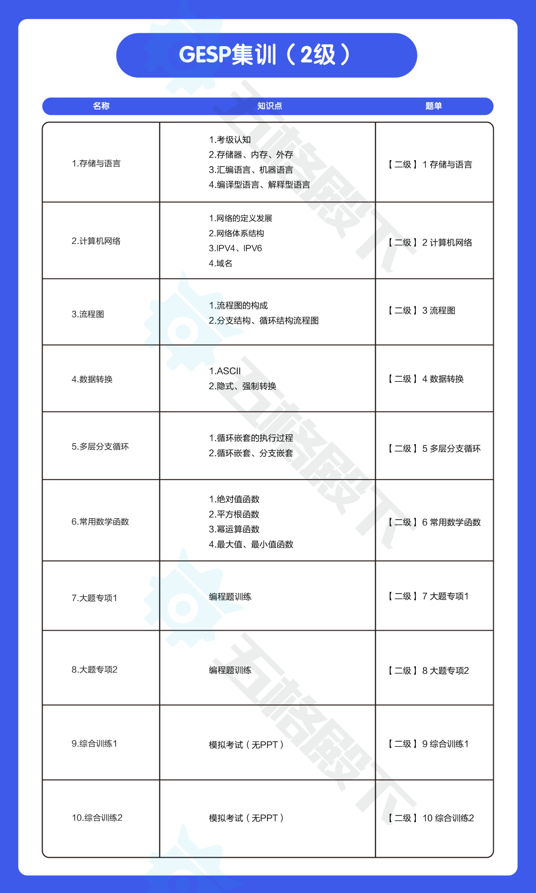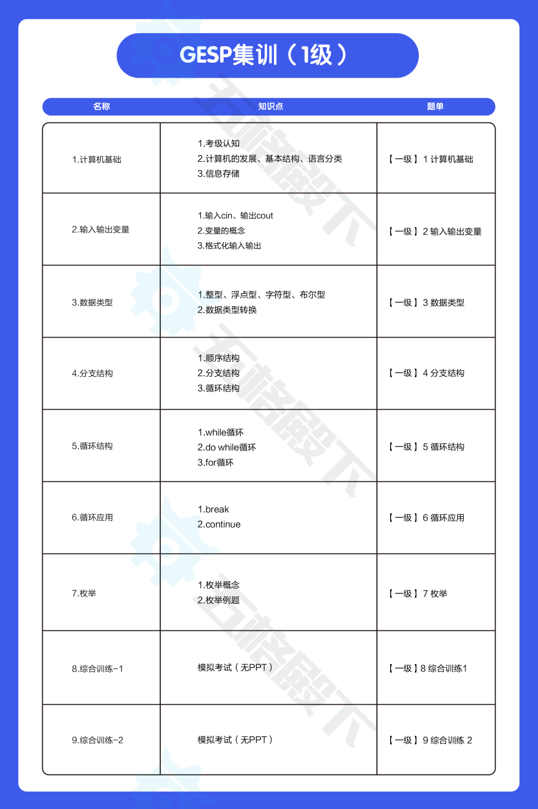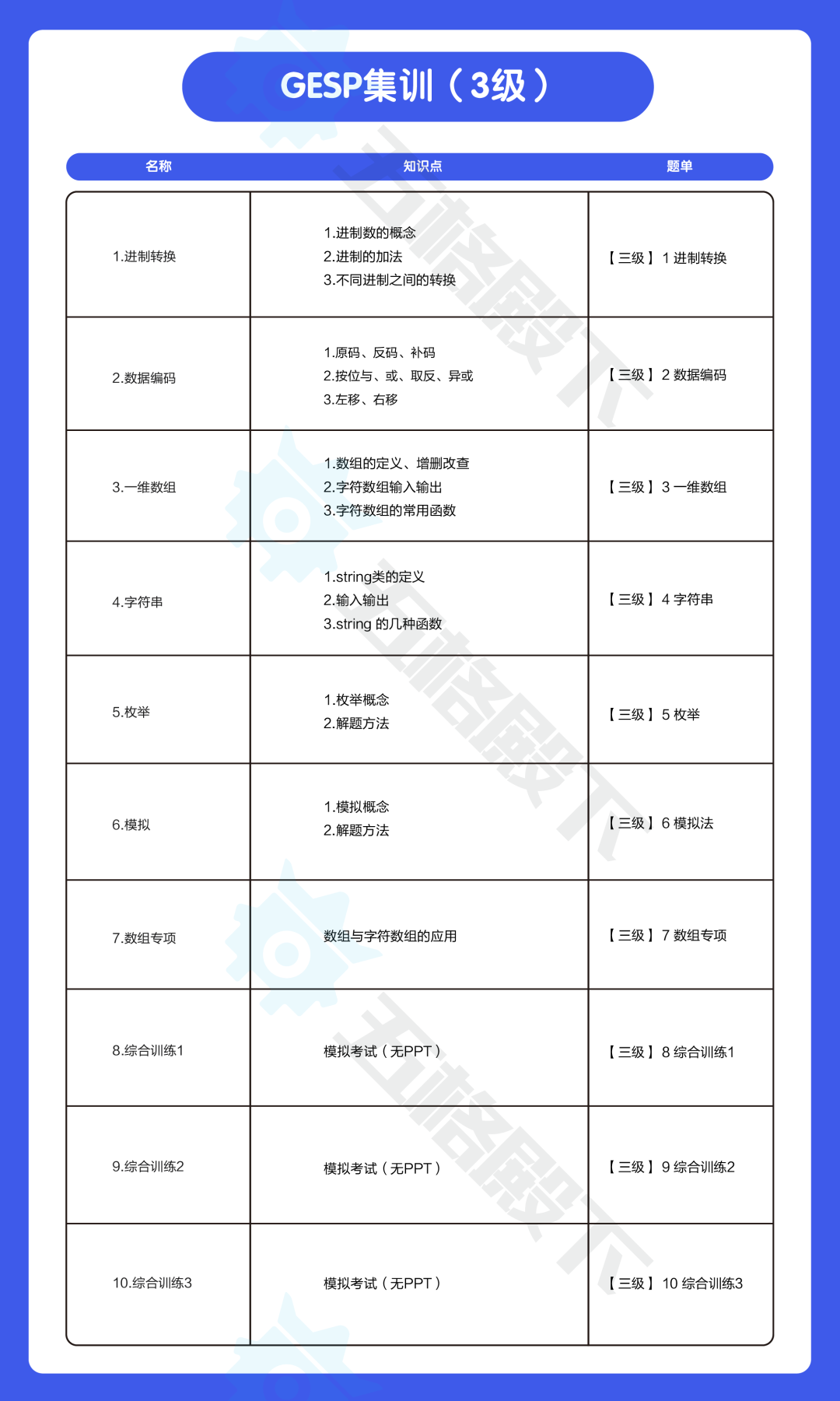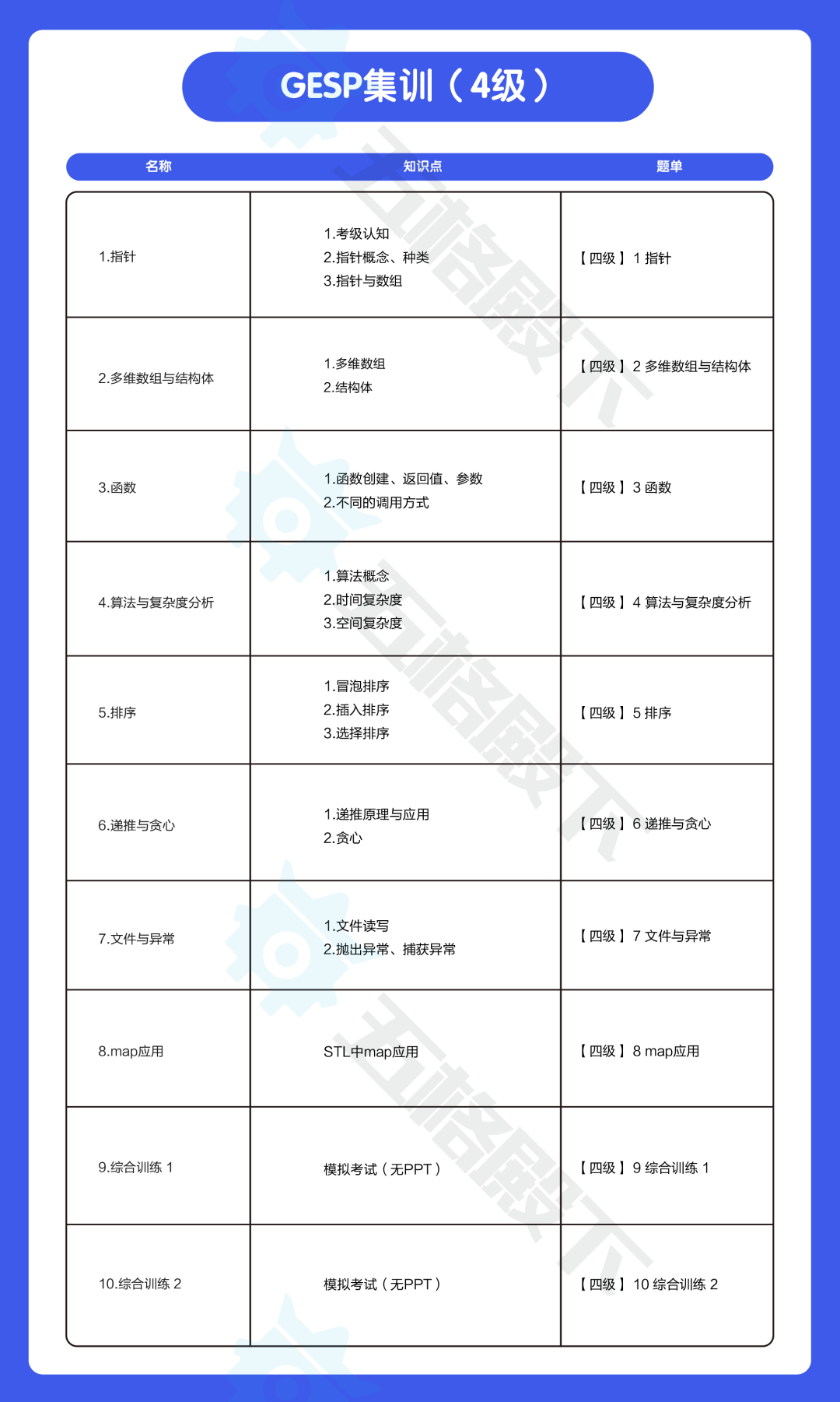 课程内容严格遵循GESP考试大纲,确保全面覆盖所有考级核心知识点,助力编程教师指导学员精准备考,为来年顺利通过考级认证打下坚实基础。