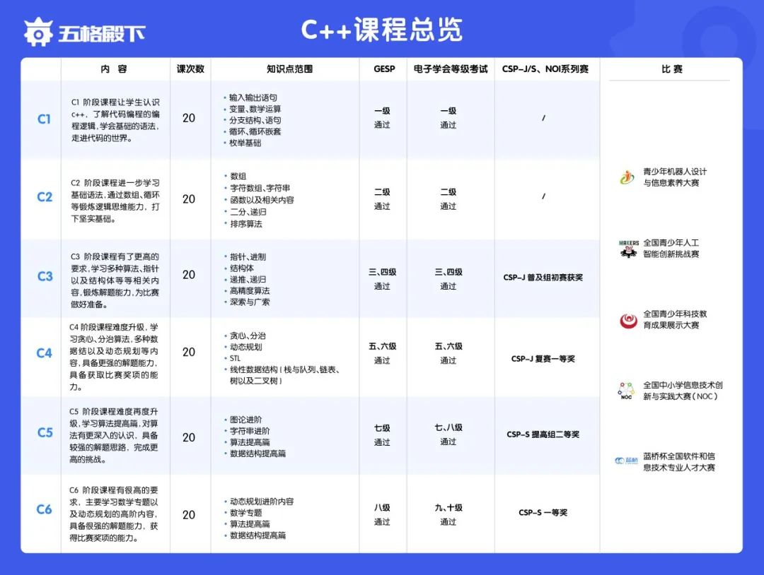 五格殿下少儿编程C++常规课程适合10岁+的孩子学习,课程一共包含C1-C6六个知识模块,总共120课次!