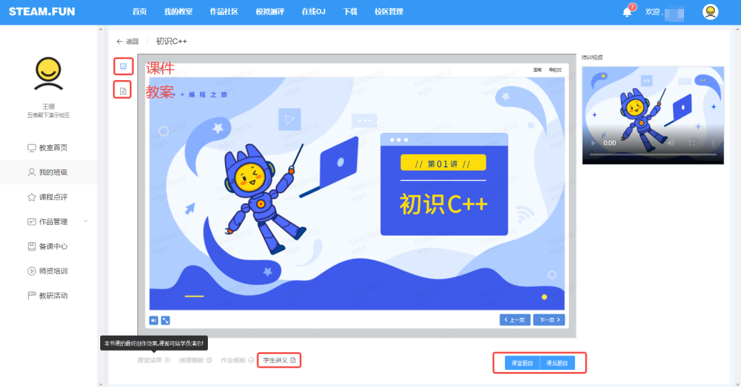 平台不仅提供满足教学需要的配套教学课件,师资教案、学生讲义,还提供课堂题目、课后题目等,齐全的物料配置,让校区老师轻松备课,节省准备物料的时间。