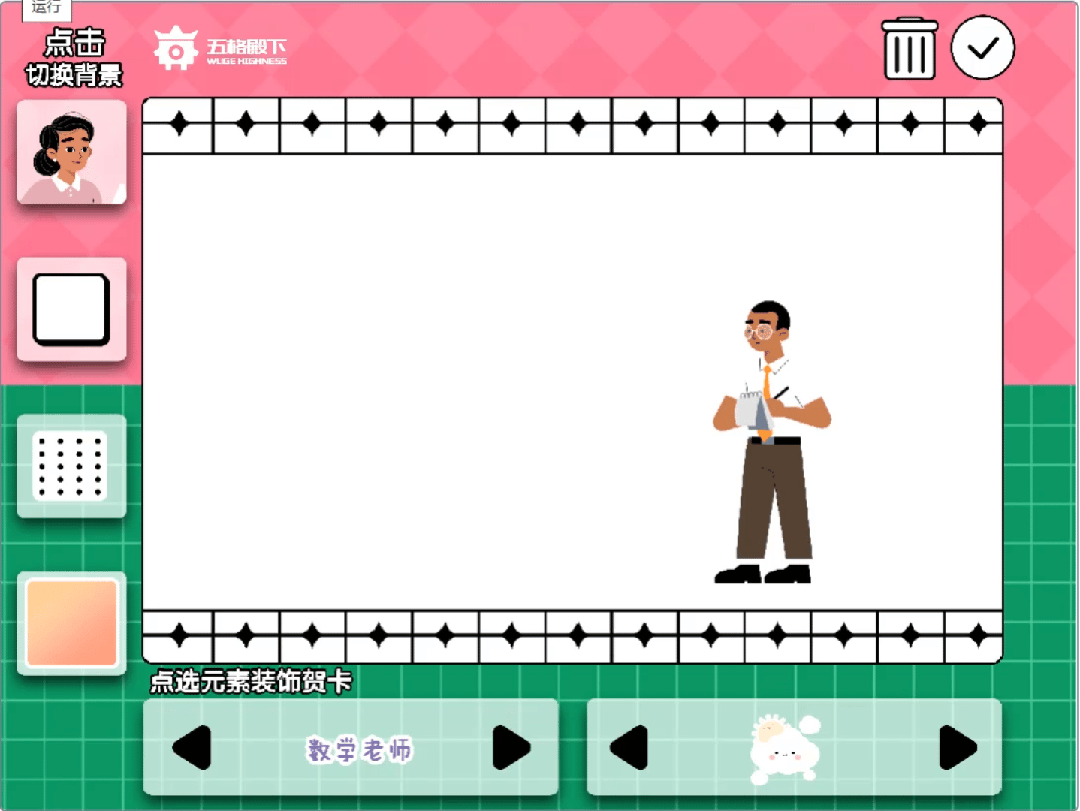 学生们可通过简单的操作,如按钮切换、点击选中、拖动、滚动等,自由组合角色、边框、贺卡、背景、文字等元素,设计出个性化的贺卡。