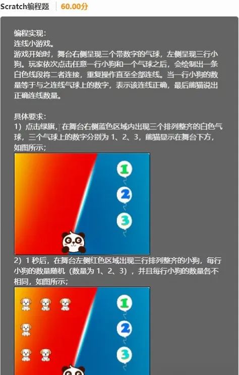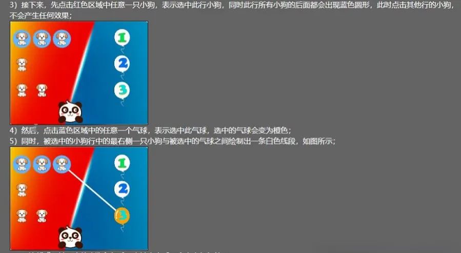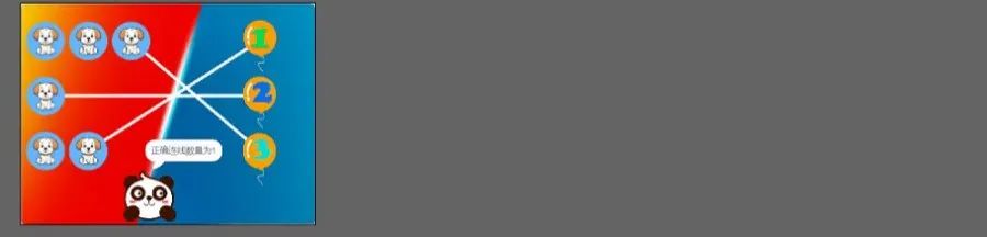 7)“重复执行‘具体要求’3)、4)、5)、6),直到三行小狗与三个气球都完成连线,此时熊猫会说‘正确连线数量为 X’(X 为实际正确连线的数量),如图所示;