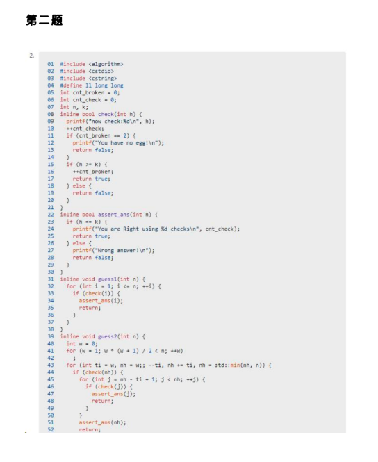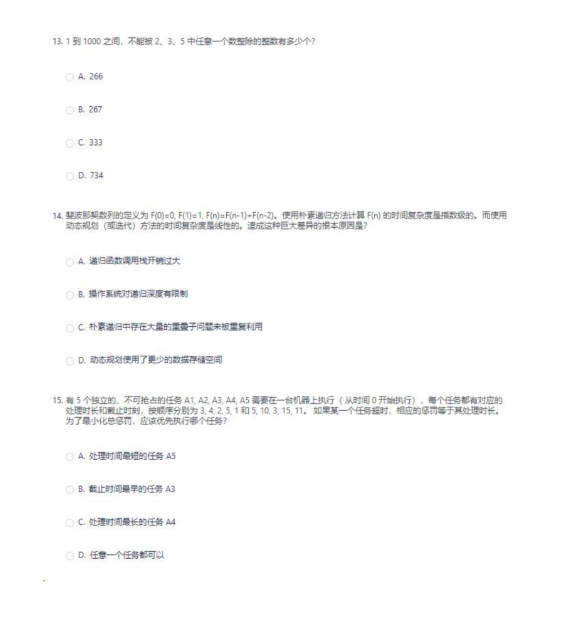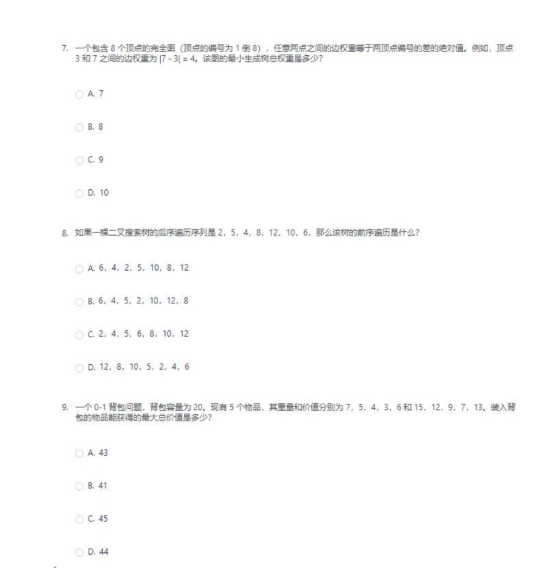 :重点考查经典算法和图论算法,如动态规划、贪心算法、深度优先搜索、广度优先搜索等。题目难度较大,需要考生具备较强的算法设计和分析能力。