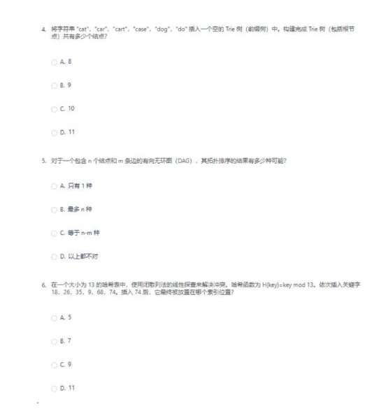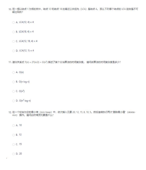 :考查一些基本的数据结构概念,如数组、链表、栈、队列等,题目通常较为简单,主要考查考生对数据结构基本操作的理解。