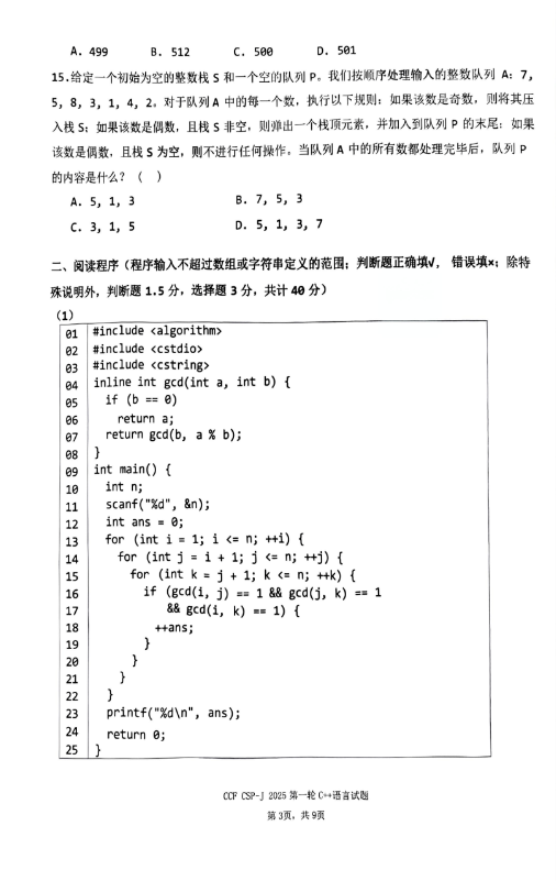 ** 入门级(CSP-J1)和提高级(CSP-S1)** 的试题结构相同,均为笔试,满分 100 分。其中单项选择题共 15 题,每题 2 分,共 30 分;阅读程序题包括判断题和选择题,共 40 分;完善程序题是单选题,每题 3 分,共 30 分。