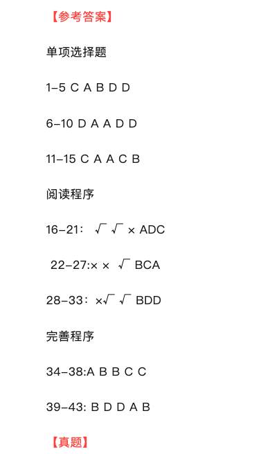 :整体难度较低,题目较为基础,适合初学者。单项选择题和阅读程序题中的大部分题目都可以通过对基础知识的掌握和简单的分析得出答案。完善程序题虽然需要考生对算法和代码有一定的理解,但也都是基于基础算法和语法进行考查。