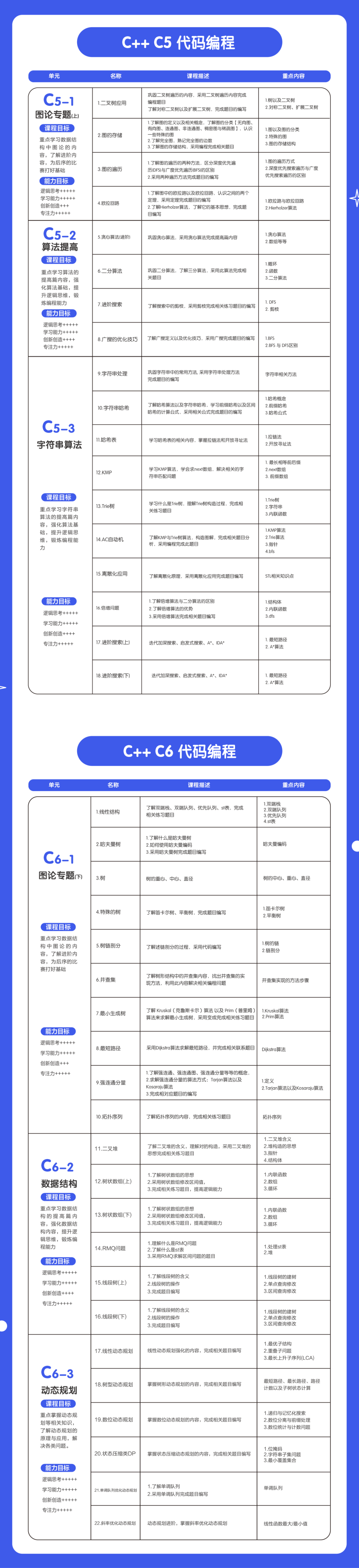 💚课程简介:主要以学习C++的算法知识为主,包括基础算法、结构体、指针等等。其次是学习贪心、分治算法,多种数据结以及动态规划等内容,加强解题能力,具备获取比赛获奖的能力。