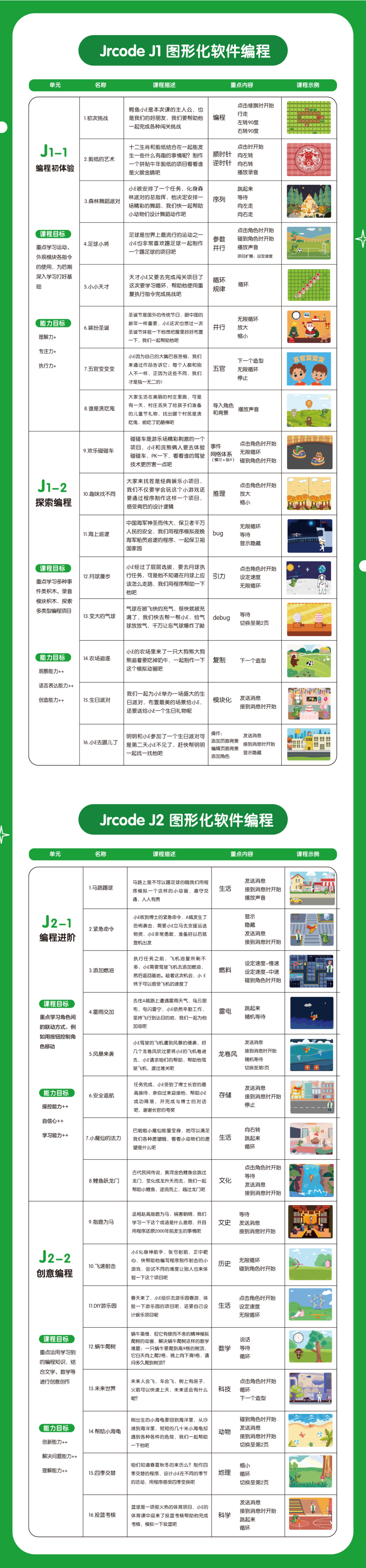 💚 课程简介:从认识计算机入手,引导孩子理解程序顺序与并列执行,学习 Jrcode 基础指令;通过闯关、绘画、游戏、动画制作等项目落地,采用螺旋式梯度设计,融合数学、语文、美术、物理等多学科知识,让孩子在成就感中入门编程。