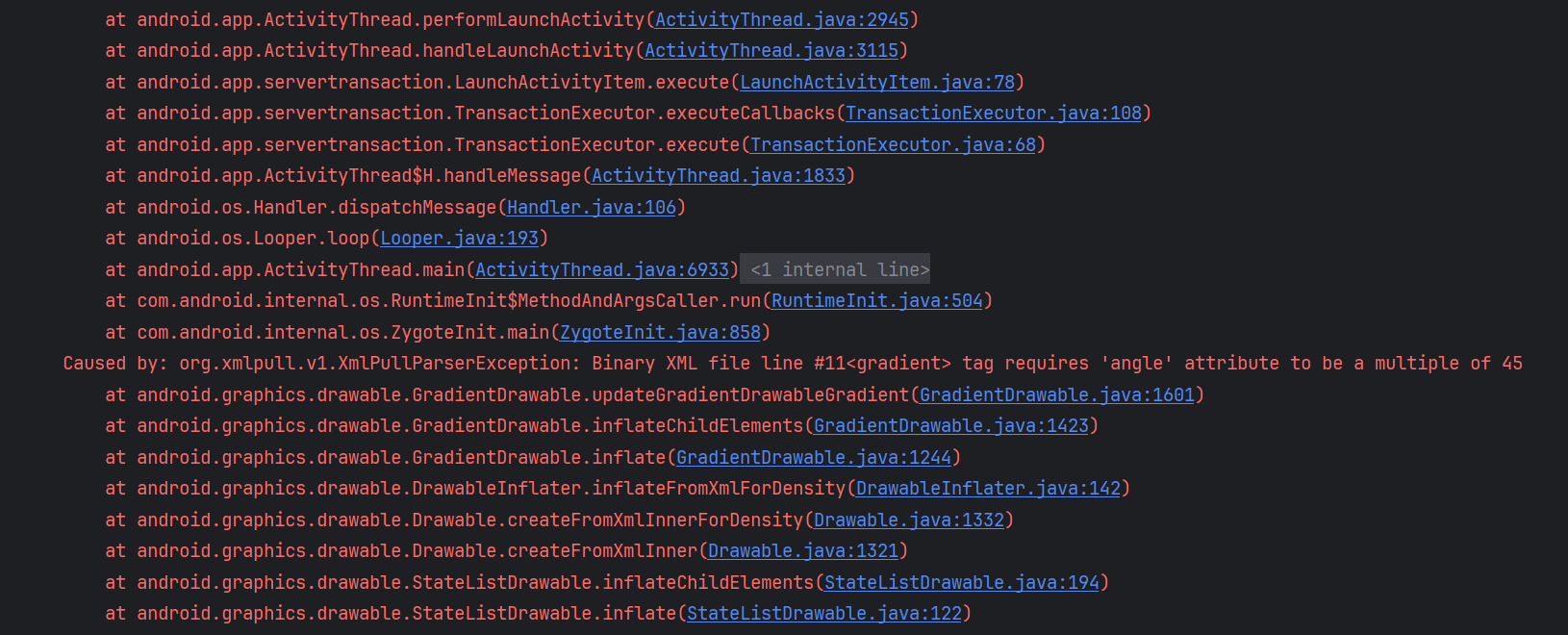 Caused by: org.xmlpull.v1.XmlPullParserException: Binary XML file line #11<gradient> tag requires 'angle' attribute to be a multiple of 45