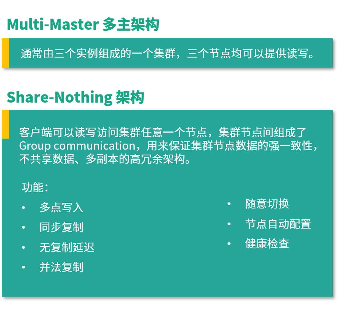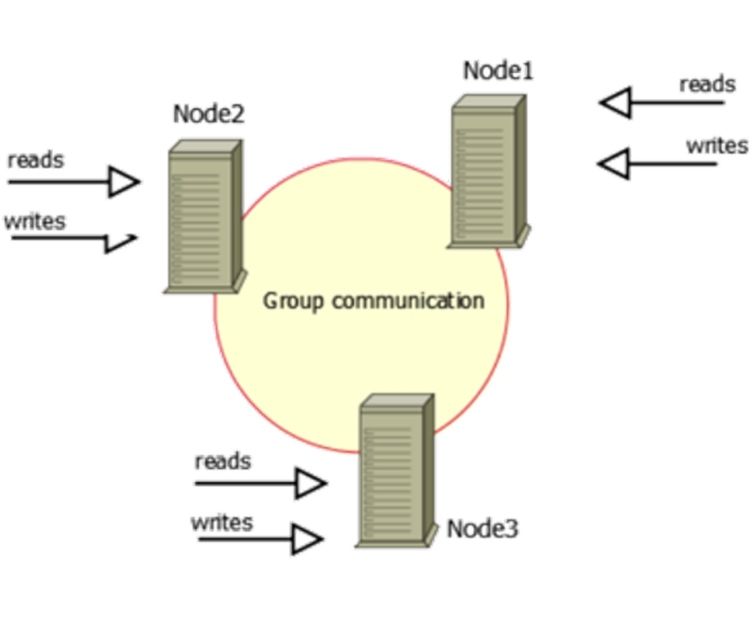 通常由三个实例组成的一个集群,三个节点均可以提供读写,即常见的 Multi-Master 多主架构。客户端可以读写访问集群任意一个节点,集群节点间组成了 Group communication,如下图所示。这可以用来保证集群节点数据的强一致性,这种架构是 Share-Nothing,不共享数据、多副本的高冗余架构,拥有多点写入、同步复制、无复制延迟、并法复制、随意切换、节点自动配置、健康检查等功能。