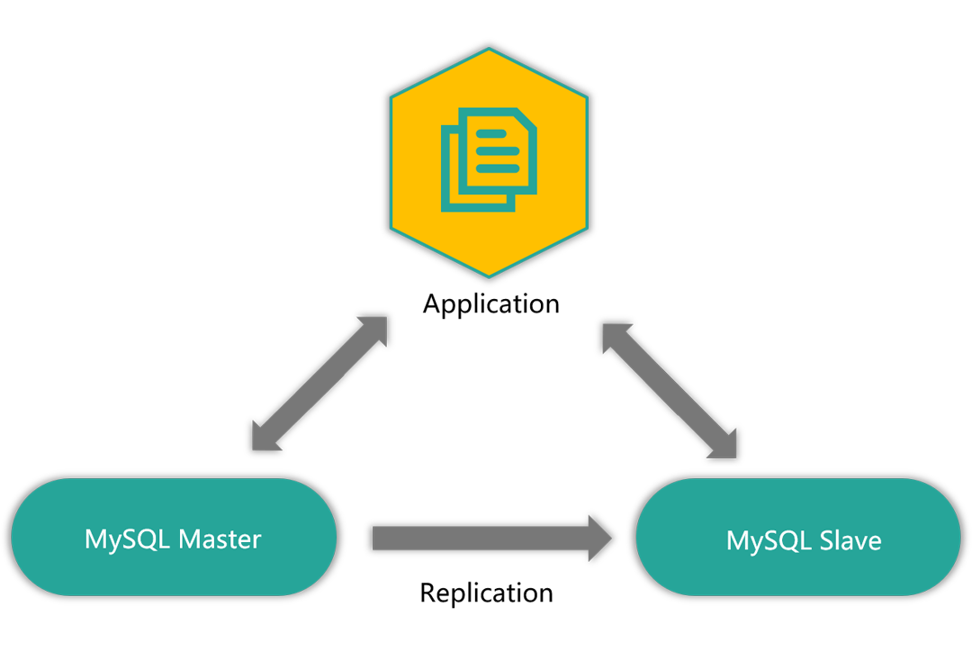 首先是基于主从构建的一主一从架构,应用程序读写直接访问 Master 或者配置 Master 和 Slave 的数据源进行人为的读写分离,当 Master 出现故障时需要人工维护介入。通常适合于轻量级程序、高可用要求不高的业务场景。如下图所示,这类架构中应用程序直连访问 Master 和 Slave 进行读写分离,当 Master 出现故障时由于无法自动切换导致服务受损。因此通常会基于此架构加上 VIP/DNS + Keepalived 及双主复制来做一个简单的高可用切换。