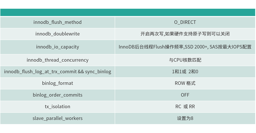 对于数据安全的场景,参数 innodb_flush_log_at_trx_commit 和 sync_log 配置为双一配合 after-sync 半同步模式是一个好的选择,这也是大部分金融场景的参数配置。