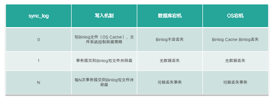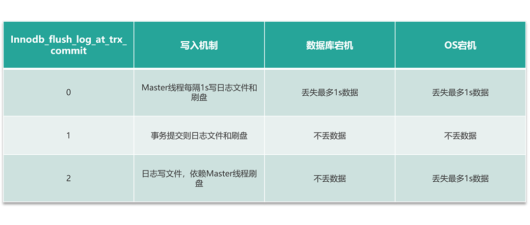当取值为 N 时,表示每 N 次事务提交,MySQL 调用文件系统的刷新操作将缓存刷新到磁盘中。如果数据库或操作系统在这个时候宕机,数据库可能会丢失一些事务。