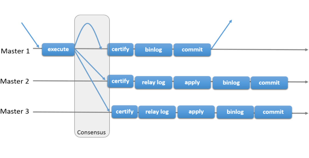如下是 MySQL Group Replication /Galera Cluster 的时序图:由 3 个节点组成一个复制组,Consensus 层为一致性协议层,在事务提交过程中,发生组间通信,由 2 个节点决议(certify)通过这个事务,事务才能够最终得以提交并响应。