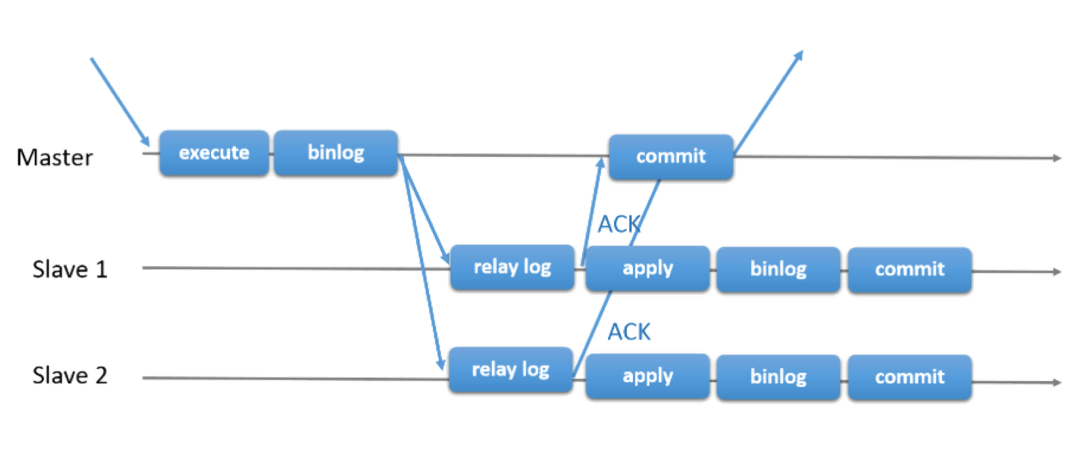 MySQL Master 将事务写入 Binlog(sync_binlog=1)并推送给 Slave 后主库将事务提交到存储引擎(此时未返回客户端但是其他会话可以访问到事务提交信息),Slave I/O Thread 将读取的 Binlog 写入到本地 relay log 文件(sync_relay=1)后向 Master 返回 ACK 消息,当主库 Master 等到 Slave 返回的 ACK 消息后 Master 将事务提交成功的结果返回给客户端。