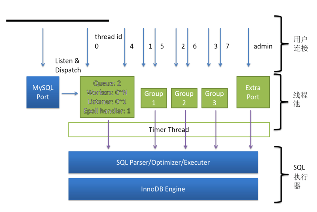 线程根据 connection id 被分配到 Group(生命周期内不变),worker 以 SQL 为单位进行处理,保证每个连接都能及时得到响应;