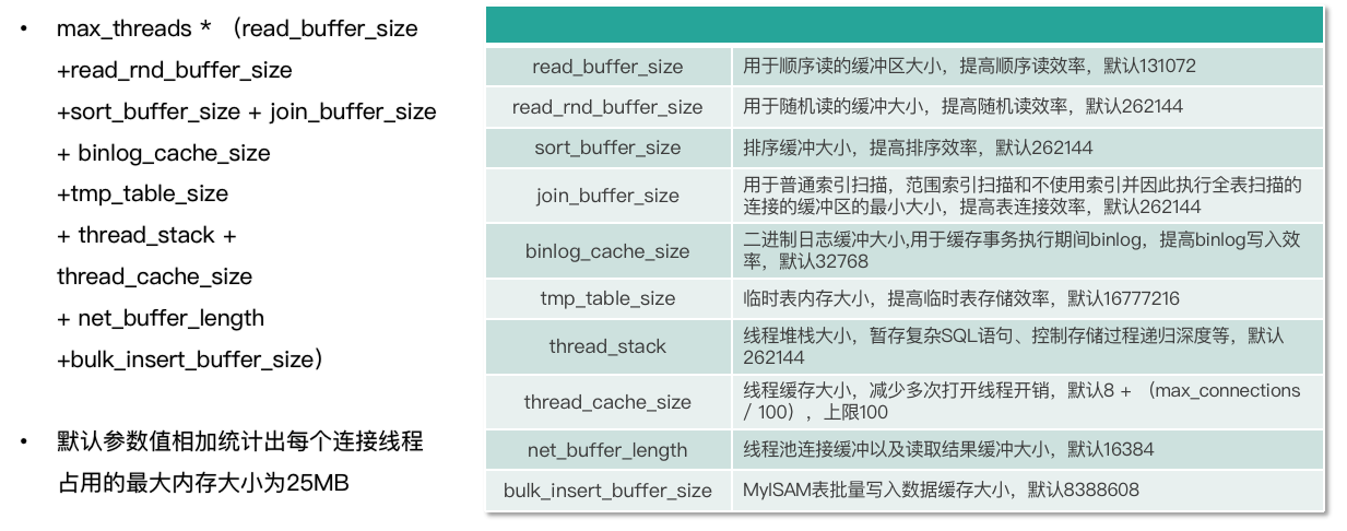 innodb_buffer_pool_size ,用于缓存行数据、索引数据,以及事务锁和自适应哈希等。 单机多实例的情况内存建议按实际数据热点数据量的30%规划,单机单实例(独享实例)的情况建议是分配50%~80%。