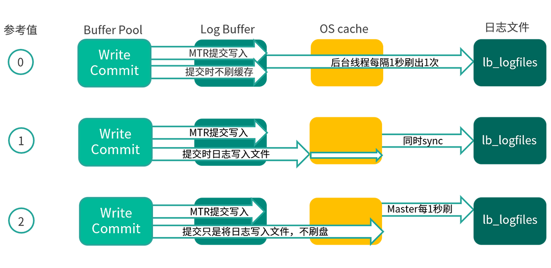 如下图,可以看到其不同取值时对应与日志缓冲区、OS cache、日志文件(ib_logfile)之间的关系。