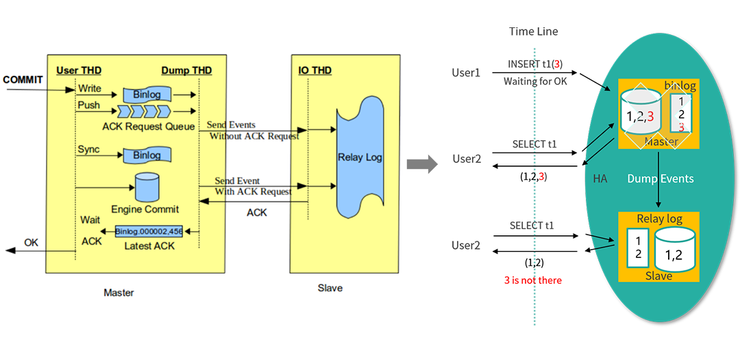 如下图所示,after-commit 的情况在非当前客户端访问数据时会出现“数据幻读”的情况,例如User1 想在 t1 表插入记录 3 并在存储引擎层提交事务,此时 User2 可以看到已经提交事务的数据记录 3。当时 Master 在等待 Slave 返回 ACK 的过程中 Crash 了并且 Slave也没有成功接受到 Binlog Event,此时 Slave 提升为 Master 时 User2 发现之前访问到的数据记录 3 又不见了。如果 Master Crash 后无法启动,那么提交的事务记录 3 在从库上永远找不到了,导致数据丢失。