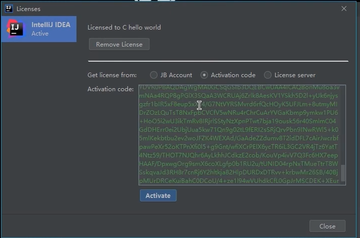 选择Activation code,粘贴刚才复制的内容,点击Activate,close关闭即可。