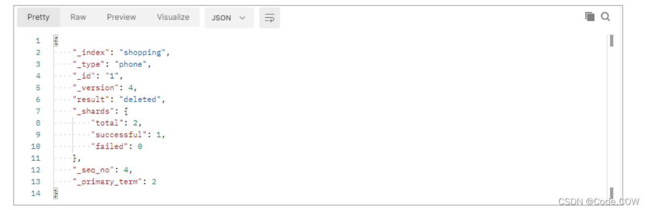 {"_index": "shopping","_type": "_doc","_id": "1","_version" 【版本】 : 4, # 对数据的操作,都会更新版本"result" 【结果】 : "deleted", # deleted 表示数据被标记为删除"_shards": {"total": 2,"successful": 1,"failed": 0},"_seq_no": 4,"_primary_term": 2}