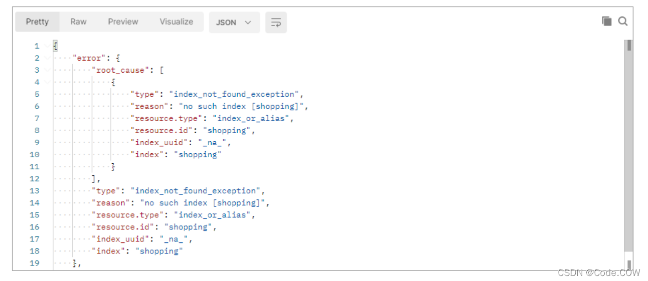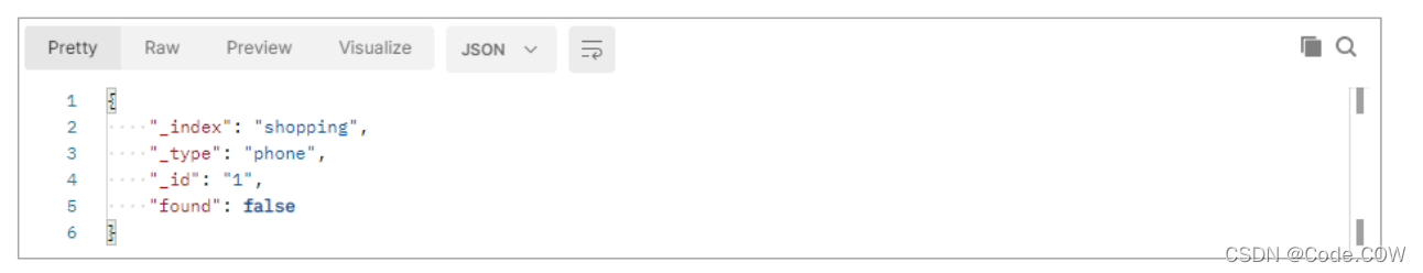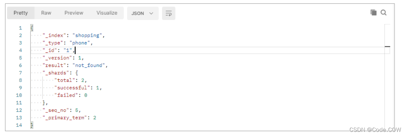 {"_index": "shopping","_type": "_doc","_id": "1","_version": 1,"result" 【结果】 : "not_found", # not_found 表示未查找到"_shards": {"total": 2,"successful": 1,"failed": 0},"_seq_no": 5,"_primary_term": 2}