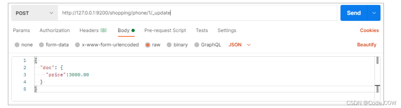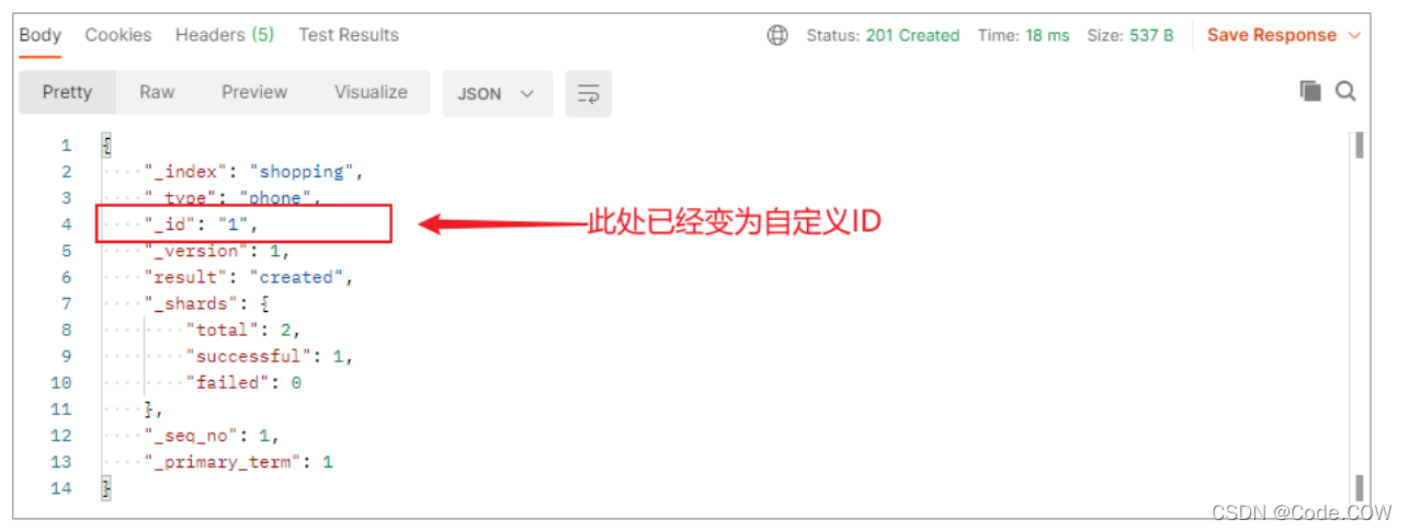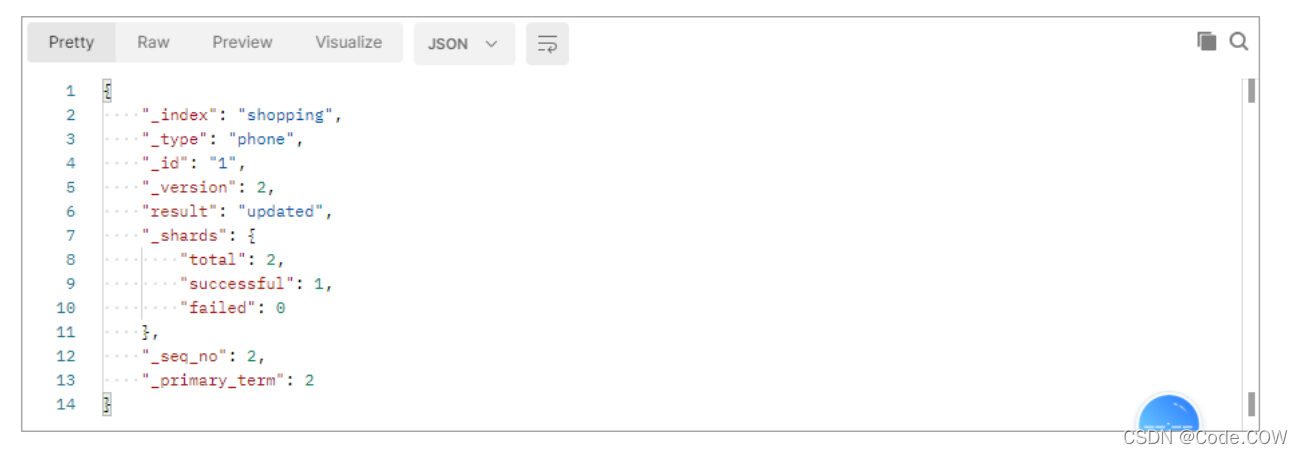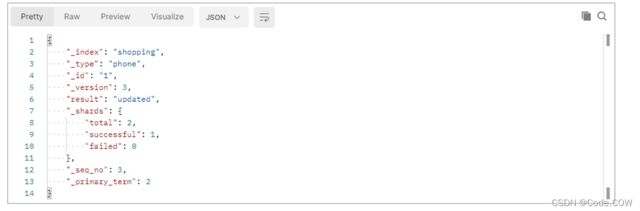 {"_index": "shopping","_type": "_doc","_id": "1","_version" 【版本】 : 2,"result" 【结果】 : "updated", # updated 表示数据被更新"_shards": {"total": 2,"successful": 1,"failed": 0},"_seq_no": 2,"_primary_term": 2}