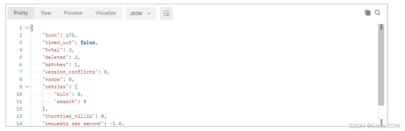{"took" 【耗时】 : 175,"timed_out" 【是否超时】 : false,"total" 【总数】 : 2,"deleted" 【删除数量】 : 2,"batches": 1,"version_conflicts": 0,"noops": 0,"retries": {"bulk": 0,"search": 0},"throttled_millis": 0,"requests_per_second": -1.0,"throttled_until_millis": 0,"failures": []}