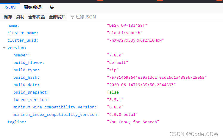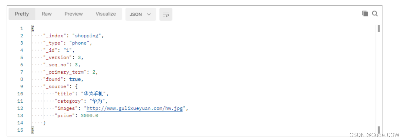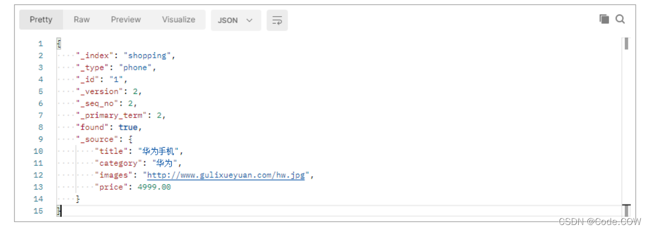 {"_index" 【索引】 : "shopping","_type" 【文档类型】 : "_doc","_id": "1","_version": 2,"_seq_no": 2,"_primary_term": 2,"found" 【查询结果】 : true, # true 表示查找到, false 表示未查找到"_source" 【文档源信息】 : {"title": " 华为手机 ","category": " 华为 ","images": "http://www.gulixueyuan.com/hw.jpg","price": 4999.00}}