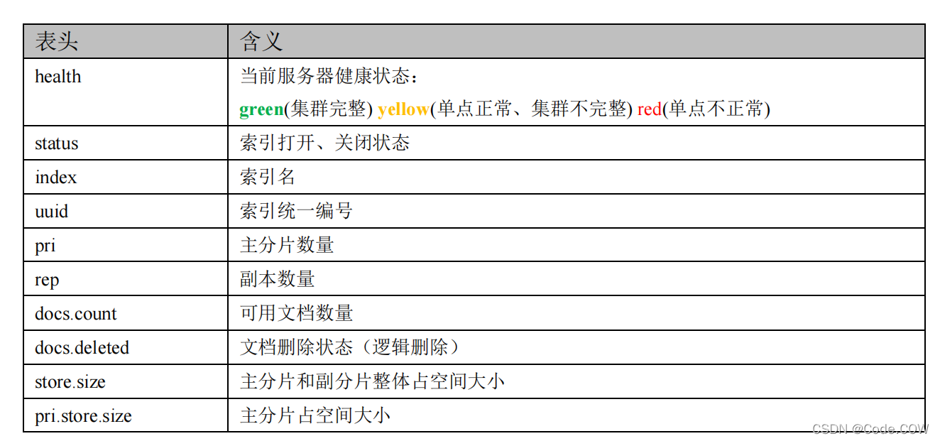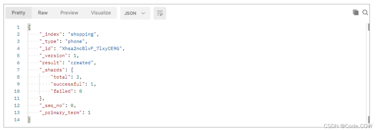 {"_index" 【索引】 : "shopping","_type" 【 类型 - 文档 】 : "_doc","_id" 【唯一标识】 : "Xhsa2ncBlvF_7lxyCE9G", # 可以类比为 MySQL 中的主键,随机生成"_version" 【版本】 : 1,"result" 【结果】 : "created", # 这里的 create 表示创建成功"_shards" 【分片】 : {"total" 【分片 - 总数】 : 2,"successful" 【分片 - 成功】 : 1,"failed" 【分片 - 失败】 : 0},"_seq_no": 0,"_primary_term": 1}