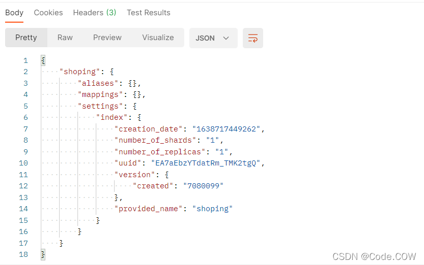 {"shopping" 【索引名】 : {"aliases" 【别名】 : {},"mappings" 【映射】 : {},"settings" 【设置】 : {"index" 【设置 - 索引】 : {"creation_date" 【设置 - 索引 - 创建时间】 : "1614265373911","number_of_shards" 【设置 - 索引 - 主分片数量】 : "1","number_of_replicas" 【设置 - 索引 - 副分片数量】 : "1","uuid" 【设置 - 索引 - 唯一标识】 : "eI5wemRERTumxGCc1bAk2A","version" 【设置 - 索引 - 版本】 : {"created": "7080099"},"provided_name" 【设置 - 索引 - 名称】 : "shopping"}}}}