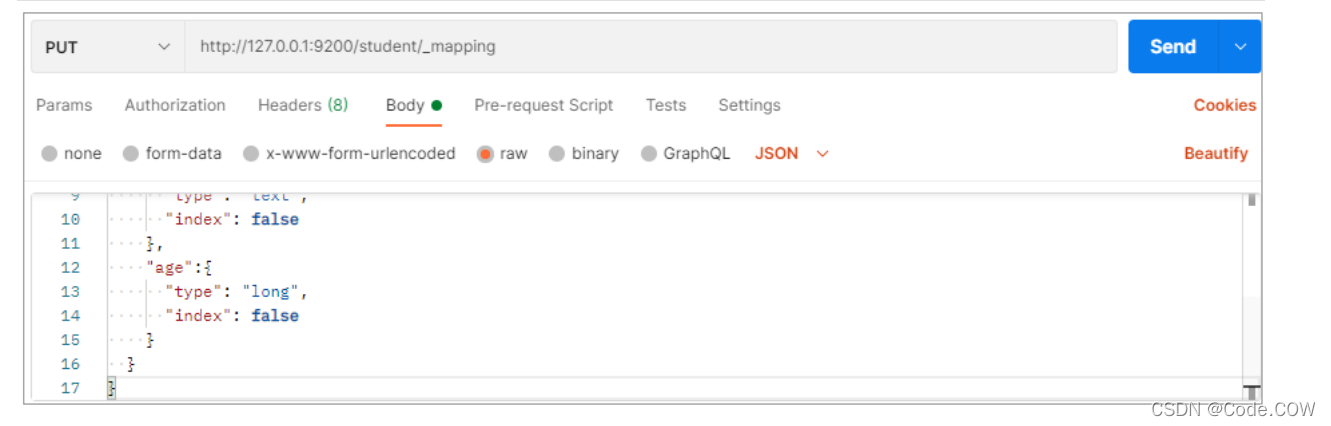 {"properties": {"name":{"type": "text","index": true},"sex":{"type": "text","index": false},"age":{"type": "long","index": false}}}