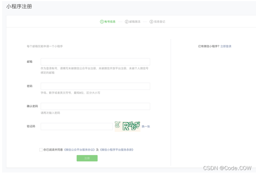 进入小程序注册页 根据指引填写信息和提交相应的资料,就可以拥有自己的小程序帐号。